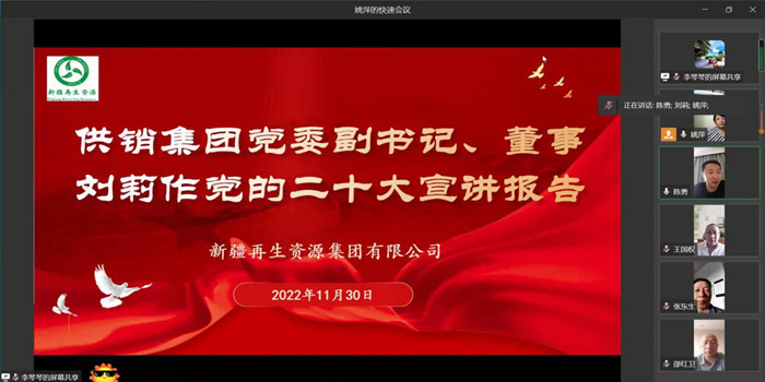 11月30日,供销集团党委副书记、董事刘莉通过线上方式,参加党建联系点再生资源集团组织生活,为党员干部作党的二十大精神专题宣讲,公司领导班子成员、中层干部参加宣讲活动。