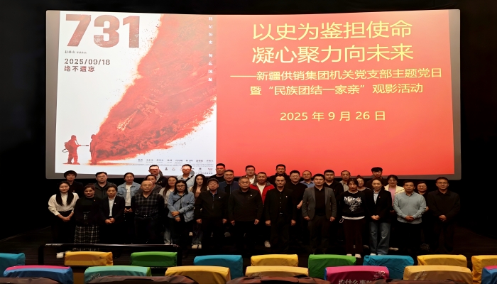 在纪念中国人民抗日战争暨世界反法西斯战争胜利80周年之际,新疆供销集团机关党支部于9月26日开展“以史为鉴担使命,凝心聚力向未来”主题党日暨“民族团结一家亲”观影活动,组织全体党员、干部职工及结对亲戚观看历史影片《731》,通过重温民族苦难与抗争历程,进一步砥砺初心使命。
